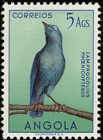 Visibility: public Image owner: none postage 1/23/1951 5a multi issue=birds 1951 dt=birds (1951 Angola) d=Lamprocolius phoenicopterus unwmk perf=11.75 Crops No visible images cropped from this one. Measurements Resolution is unknown. Source Source name: Colnect File URL: http://i.colnect.net/b/1762/545/Cape-Glossy-Starling-Lamprotornis-nitens-.jpg Uploaded May 13, 2014, 7:00 pm by Stan Shebs |