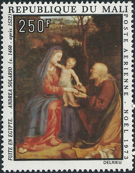 Visibility: public Image owner: none airmail 11/30/1973 250fr multi issue=Christmas 1973 d="Flight into Egypt" - A. Solario unwmk perf=13x12.5 Crops No visible images cropped from this one. Measurements Resolution is unknown. Source Source name: Colnect File URL: http://i.colnect.net/images/b/2149/770/Flight-into-Egypt-by-Andrea-Solario.jpg Uploaded July 1, 2014, 3:30 pm by Stan Shebs  |