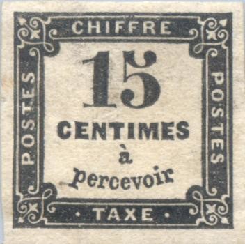 Visibility: public Image owner: none postage due 15c blk issue=1859 due d=numeral (1859 France) unwmk perf=13 Crops No visible images cropped from this one. Measurements Resolution is unknown. Source Source name: Colnect File URL: http://i.colnect.net/images/b/146/945/Tax--Chiffre-Taxe-.jpg Uploaded October 19, 2012, 4:40 pm by Stan Shebs |