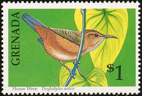 Visibility: public Image owner: none postage 9/10/1990 $1 multi dt=birds (1990 Grenada) d=House Wren Troglodytes aedon wmk=St Edwards crown & CA perf=15clean Crops No visible images cropped from this one. Measurements Resolution is unknown. Source Source name: Colnect File URL: http://i.colnect.net/images/b/2192/507/House-Wren-Troglodytes-aedon.jpg Uploaded October 18, 2014, 4:51 pm by Stan Shebs |