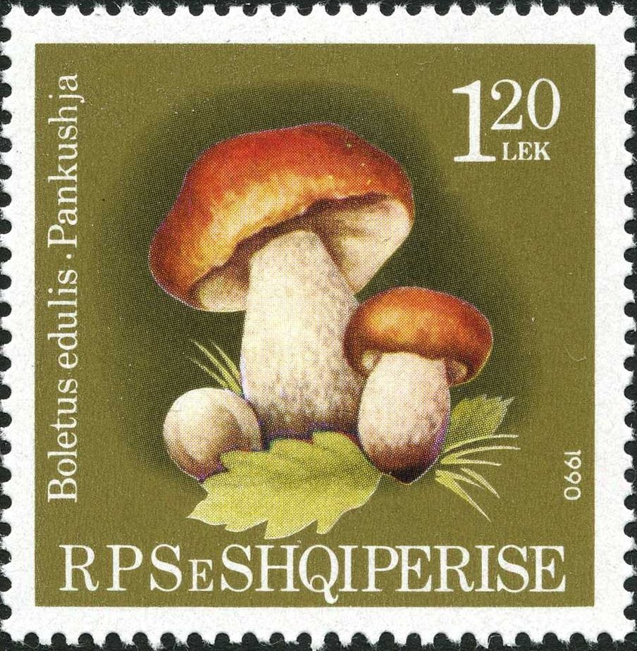 Visibility: public Image owner: none postage 4/28/1990 1.2L multi dt=mushrooms (1990 Albania) d=Boletus edulis (1990 Albania) unwmk perf=12 Crops No visible images cropped from this one. Measurements Resolution is unknown. Source Source name: Colnect File URL: http://i.colnect.net/b/2025/619/Cep-Boletus-edulis.jpg Uploaded October 21, 2014, 5:53 pm by Stan Shebs |