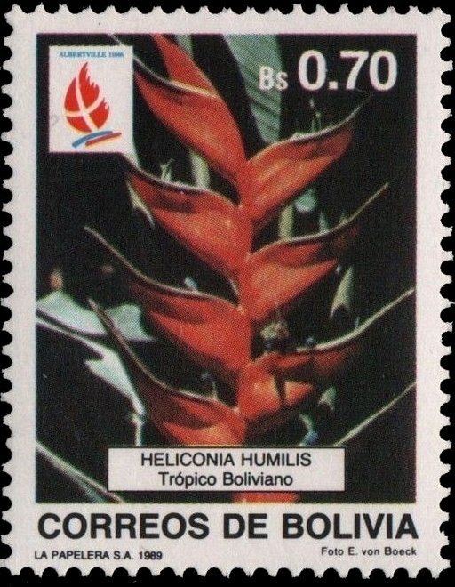 Visibility: public Image owner: none postage 2/17/1989 0.70b multi dt=plants (1989 Bolivia) d=Heliconia humilis unwmk Crops No visible images cropped from this one. Measurements Resolution is unknown. Source Source name: Colnect File URL: http://i.colnect.net/b/2322/996/Heliconia-humilis.jpg Uploaded December 7, 2014, 4:59 pm by Stan Shebs |