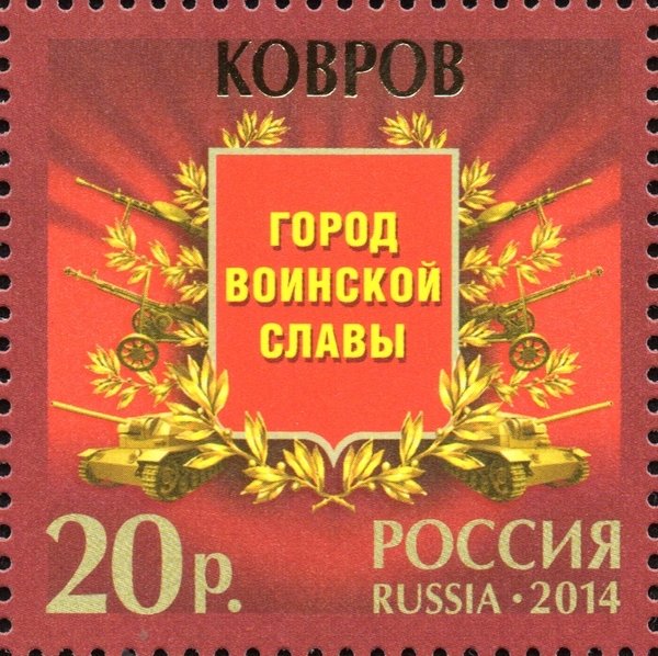 Visibility: public Image owner: none postage 8/28/2014 20r multi issue=Towns of Military Glory d=Kovrov unwmk Crops No visible images cropped from this one. Measurements Resolution is unknown. Source Source name: Colnect File URL: http://i.colnect.net/b/2240/174/Kovrov-City-of-Military-Glory.jpg Uploaded December 21, 2014, 11:21 pm by Stan Shebs |