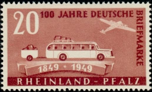 Visibility: public Image owner: none postage 9/17/1949 20pf redbrn issue=German stamp 100th d=post bus with trailer & plane unwmk perf=14 Crops No visible images cropped from this one. Measurements Resolution is unknown. Source Source name: Colnect File URL: http://i.colnect.net/images/b/838/339/100-Years-German-Stamps.jpg Uploaded February 1, 2015, 5:07 am by Stan Shebs |