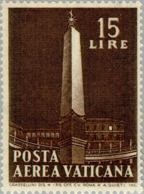 Visibility: public Image owner: none airmail 10/27/1959 15l dkbrn issue=1959 air dt=obelisks wmk=crossed keys Crops No visible images cropped from this one. Measurements Resolution is unknown. Source Source name: Colnect File URL: http://i.colnect.net/b/150/669/Vatican-Obelisk-and-Apostolic-Palace.jpg Uploaded August 22, 2014, 11:53 pm by Stan Shebs |