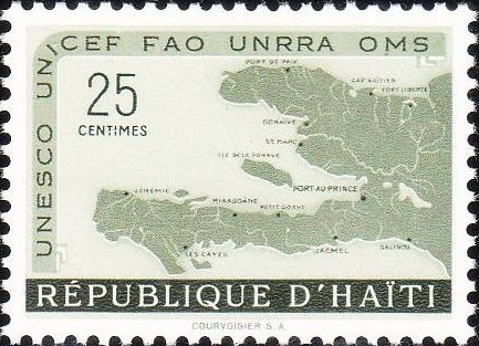 Visibility: public Image owner: none postage 12/5/1958 25c dkgrn issue=United Nations d=Haiti map unwmk Crops No visible images cropped from this one. Measurements Resolution is unknown. Source Source name: Colnect File URL: http://i.colnect.net/b/2389/195/Haiti-map.jpg Uploaded May 26, 2015, 12:40 pm by Stan Shebs |