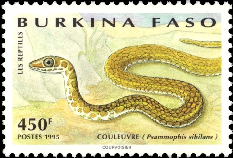 Visibility: public Image owner: none postage 12/31/1995 450fr multi dt=reptiles (1995 Burkina Faso) d=Psammophis sibilans unwmk Crops No visible images cropped from this one. Measurements Resolution is unknown. Source Source name: Colnect File URL: http://i.colnect.net/b/2631/936/Striped-Sand-Snake-Psammophis-sibilans.jpg Uploaded June 23, 2015, 4:57 pm by Stan Shebs |