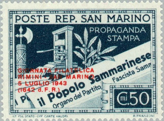 Visibility: public Image owner: none postage 7/1/1943 50c grnblk ovpt=GIORNATA... oc=blk on=issue=newspaper-50c wmk=crown (Italy) Crops No visible images cropped from this one. Measurements Resolution is unknown. Source Source name: Colnect File URL: http://i.colnect.net/b/168/115/Philatelic-day-Rimini-San-Marino.jpg Uploaded August 23, 2014, 4:28 pm by Stan Shebs |