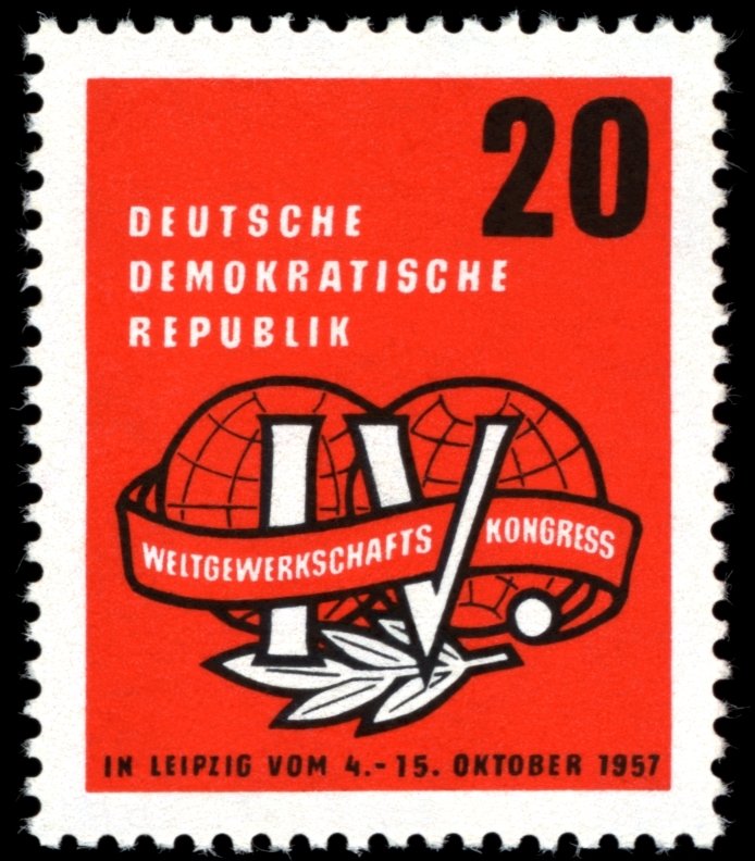 Visibility: public Image owner: none postage 8/23/1957 20pf red&blk issue=4th World Trade Union Congress Crops No visible images cropped from this one. Measurements Resolution is unknown. Source Source name: Colnect File URL: http://i.colnect.net/images/b/1970/473/Labour-congress.jpg Uploaded October 5, 2015, 1:02 am by Stan Shebs |