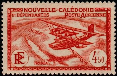 Visibility: public Image owner: none airmail 4.50fr red issue=1938 air d=seaplane over Pacific unwmk Crops No visible images cropped from this one. Measurements Resolution is unknown. Source Source name: Colnect File URL: http://i.colnect.net/b/859/618/Seaplane-and-Map-of-New-Caledonia.jpg Uploaded August 24, 2014, 2:24 pm by Stan Shebs |