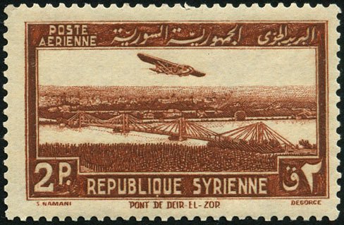 Visibility: public Image owner: none airmail 5/15/1940 2p dkorgbrn issue=1940 air d=plane over Bridge of Deir el Zor unwmk Crops No visible images cropped from this one. Measurements Resolution is unknown. Source Source name: Colnect File URL: http://i.colnect.net/b/884/882/Plane-and-Bridge-of-Deir-el-Zor.jpg Uploaded August 24, 2014, 4:27 pm by Stan Shebs |