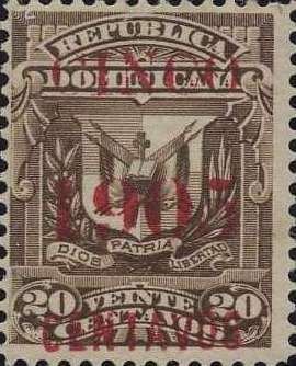 Visibility: public Image owner: none postage 4/4/1905 5c brn d=arms of the Dominican Republic (1885) ovpt=value//1905//CENTAVOS oc=blk on=1885-20c-brn unwmk perf=12 Crops No visible images cropped from this one. Measurements Resolution is unknown. Source Source name: Colnect File URL: http://i.colnect.net/b/3076/754/Coat-of-Arms-Mi-65-overprinted-in-red-5c-on-20c.jpg Uploaded June 3, 2016, 7:13 pm by Stan Shebs |