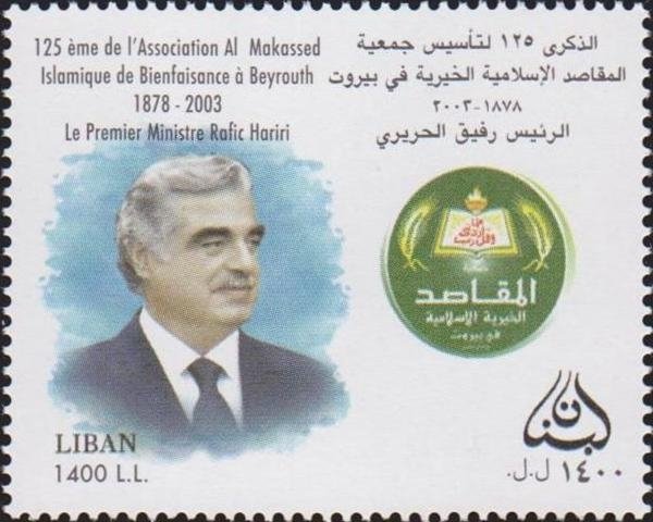 Visibility: public Image owner: none postage 7/2/2007 1400l£ multi issue=125th Anniversary of the Islamic Welfare Organization Makassed in Beirut unwmk Crops No visible images cropped from this one. Measurements Resolution is unknown. Source Source name: Colnect File URL: http://i.colnect.net/b/3079/376/Rafic-Hariri-1944-2005.jpg Uploaded June 23, 2016, 10:08 pm by Stan Shebs |