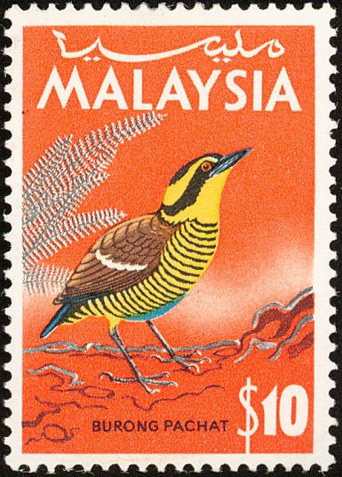 Visibility: public Image owner: none postage 9/9/1965 $10 multi dt=birds (1965 Malaysia) d=Pitta guajana (1965) wmk=PTM multiple perf=14.5 Crops No visible images cropped from this one. Measurements Resolution is unknown. Source Source name: Colnect File URL: http://i.colnect.net/images/b/2359/652/Banded-Pitta-Pitta-guajana.jpg Uploaded June 28, 2016, 10:27 pm by Stan Shebs |