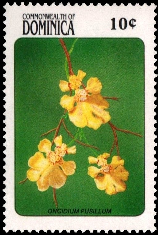 Visibility: public Image owner: none postage 9/28/1989 10c multi dt=orchids (1989 Dominica) d=Oncidium pusillum wmk=mult crown & script CA perf=14 Crops No visible images cropped from this one. Measurements Resolution is unknown. Source Source name: Colnect File URL: http://i.colnect.net/b/2293/269/Oncidium-Pusillum.jpg Uploaded April 17, 2017, 8:19 pm by Stan Shebs |