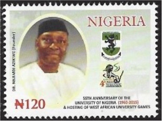 Visibility: public Image owner: none postage 10/23/2015 120n multi issue=55th Anniversary of the University of Nigeria d=Dr. Nnamdi Azikiwe unwmk Crops No visible images cropped from this one. Measurements Resolution is unknown. Source Source name: Colnect File URL: http://i.colnect.net/b/3888/918/Dr-Nnamdi-Azikiwe.jpg Uploaded May 25, 2017, 3:32 pm by Stan Shebs |