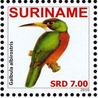 Visibility: public Image owner: none postage 5/26/2010 $7.00 multi dt=birds (2010 Surinam) d=Galbula albirostris unwmk perf=14 Crops No visible images cropped from this one. Measurements Resolution is unknown. Source Source name: Colnect File URL: http://i.colnect.net/b/3837/139/Yellow-billed-Jacamar Galbula-albirostris.jpg Uploaded June 10, 2017, 2:51 am by Stan Shebs |