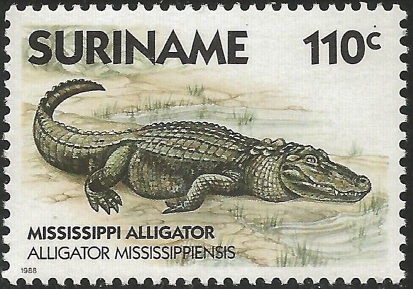 Visibility: public Image owner: none postage 1/20/1988 110c multi dt=reptiles (1988 Surinam) d=Alligator mississippiensis (1988) unwmk perf=14x12.75 Crops No visible images cropped from this one. Measurements Resolution is unknown. Source Source name: Colnect File URL: http://i.colnect.net/b/3620/703/American-Alligator-Alligator-mississippiensis.jpg Uploaded June 10, 2017, 3:33 am by Stan Shebs |