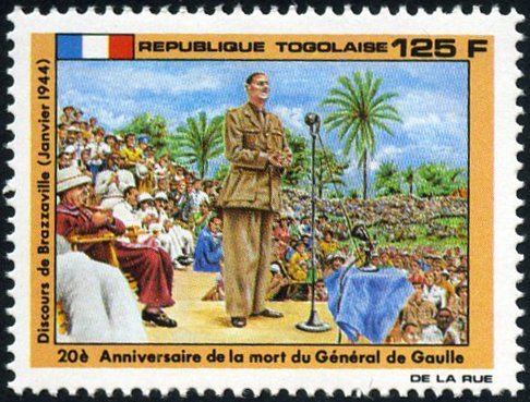 Visibility: public Image owner: none postage 8/30/1990 125fr multi issue=20th Anniversary of the Death of Charles de Gaulle unwmk perf=14 Crops No visible images cropped from this one. Measurements Resolution is unknown. Source Source name: Colnect File URL: http://i.colnect.net/b/3465/761/Charles-de-Gaulle-Speech-at-Brazzaville-1944.jpg Uploaded June 13, 2017, 4:05 pm by Stan Shebs |