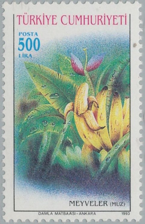 Visibility: public Image owner: none postage 4/28/1993 500l multi dt=fruits (1993 Turkey) d=Musa sapientium unwmk perf=13x13.25 Crops No visible images cropped from this one. Measurements Resolution is unknown. Source Source name: Colnect File URL: http://i.colnect.net/b/2673/987/Bananas.jpg Uploaded June 15, 2017, 3:16 pm by Stan Shebs |