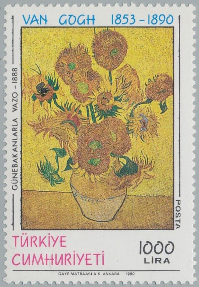 Visibility: public Image owner: none postage 7/29/1990 1000l multi dt=Van Gogh paintings (1990) d=Vase with Sunflowers wmk=PTT & crescent & star perf=12.75x13 Crops No visible images cropped from this one. Measurements Resolution is unknown. Source Source name: Colnect File URL: http://i.colnect.net/b/2673/783/Vase-with-Sunflowers.jpg Uploaded June 15, 2017, 7:34 pm by Stan Shebs |