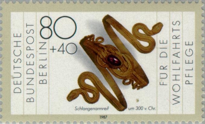 Visibility: public Image owner: none semipostal 10/15/1987 80+40pf gray&multi issue=Welfare 1987 dt=Gold and Silversmithing d=Snake bangle approx 300 BC unwmk perf=14 Crops No visible images cropped from this one. Measurements Resolution is unknown. Source Source name: Colnect File URL: http://i.colnect.net/b/155/641/Snake-bangle-approx-300-BC.jpg Uploaded December 4, 2012, 4:39 am by Stan Shebs |