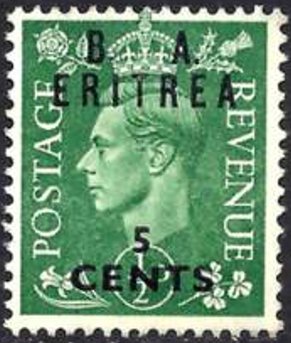 Visibility: public Image owner: none postage 2/6/1950 5c grn issue=1950 d=King George VI (1937 a) ovpt=B. A.//ERITREA//value oc=blk on=issuer=Great Britain-1941-1/2d-grn-King George VI wmk=crown & GVIR perf=15x14 Crops No visible images cropped from this one. Measurements Resolution is unknown. Source Source name: Colnect File URL: http://i.colnect.net/b/3276/292/British-Stamp-Overprinted--BA-Eritrea-.jpg Uploaded June 22, 2017, 10:08 pm by Stan Shebs |