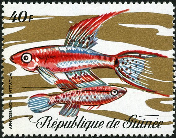 Visibility: public Image owner: none postage 4/1/1971 40fr multi dt=fishes (1971 Guinea) d=Aphyosemion bivittatum (1971) unwmk Crops No visible images cropped from this one. Measurements Resolution is unknown. Source Source name: Colnect File URL: http://i.colnect.net/b/3726/969/Two-stripe-Killifish-Aphyosemion-bivittatum.jpg Uploaded June 27, 2017, 11:46 am by Stan Shebs |