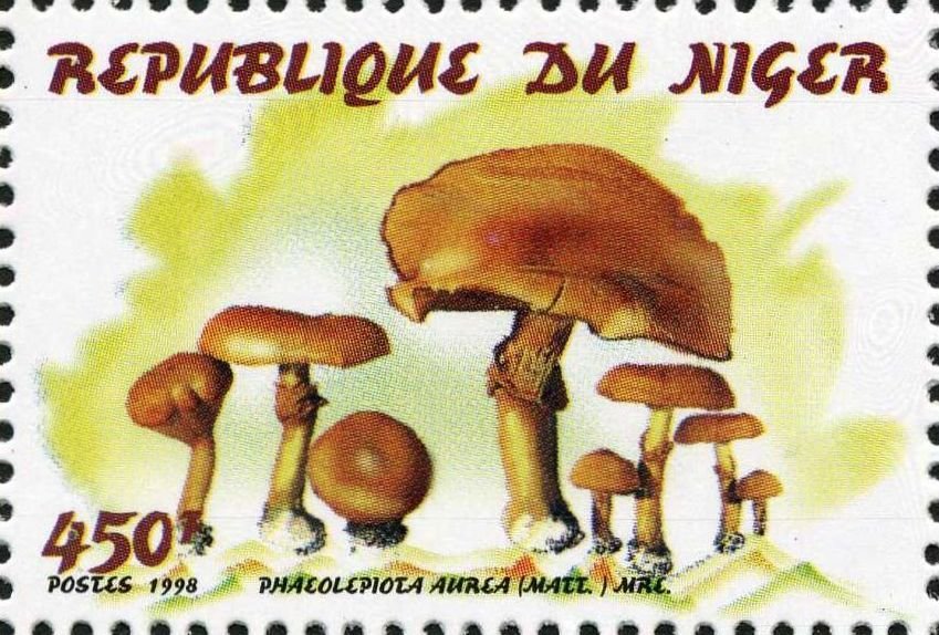Visibility: public Image owner: none postage 9/2/1998 450fr multi issue=Fungi 1998 dt=Fungi (1998 Niger) d=Phaeolepiota aurea unwmk perf=13.25 Crops No visible images cropped from this one. Measurements Resolution is unknown. Source Source name: Colnect File URL: http://i.colnect.net/b/3190/242/Phaeolepiota-aurea.jpg Uploaded June 29, 2017, 12:34 pm by Stan Shebs |