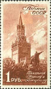 Visibility: public Image owner: none postage 9/5/1946 1r redbrn dt=Moscow scenes d=Spasskaya Tower (1946) unwmk perf=12 Crops No visible images cropped from this one. Measurements Resolution is unknown. Source Source name: Colnect File URL: http://i.colnect.net/b/192/881/-Monument-of-Minin-and-Pozharsky-against-the-Spasskaya-Tower.jpg Uploaded August 25, 2014, 6:13 pm by Stan Shebs |