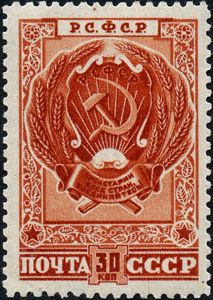Visibility: public Image owner: none postage 2/9/1947 30k brnred dt=arms of republics d=arms of Russian SSR unwmk perf=12 Crops No visible images cropped from this one. Measurements Resolution is unknown. Source Source name: Colnect File URL: http://i.colnect.net/b/1069/776/The-Arms-of-the-Russian-Soviet-Federative-Socialist-Republic.jpg Uploaded August 25, 2014, 6:13 pm by Stan Shebs |