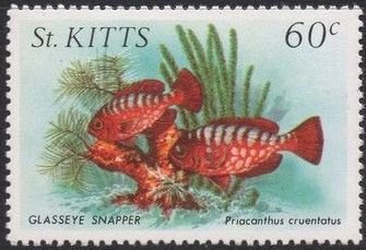 Visibility: public Image owner: none postage 7/4/1984 60c multi issue=1984 dt=marine life (1984 St. Kitts) d=Priacanthus cruentatus (1984) perf=14 Crops No visible images cropped from this one. Measurements Resolution is unknown. Source Source name: Colnect File URL: http://i.colnect.net/b/3680/265/Glasseye-snapper.jpg Uploaded June 30, 2017, 4:59 pm by Stan Shebs |