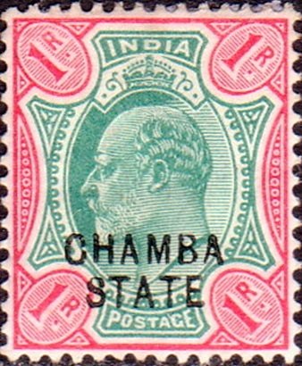 |   (338 x 410 pixels) | Type: stamp Issuer: Chamba  Date: 1904 Denom: ? Visibility: public Image owner: none postage 1r carrose&grn issue=1903 d=King Edward VII (1902 India 1r) ovpt=CHAMBA//STATE oc=blk on=issuer=India-1902-1r-carrose&grn wmk=star Crops No visible images cropped from this one. Measurements Resolution is unknown. Source Source name: Colnect File URL: http://i.colnect.net/b/3172/517/King-Edward-VII.jpg Uploaded July 5, 2017, 11:03 am by Stan Shebs |