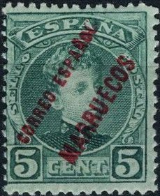 Visibility: public Image owner: none Current identification: postage 1903 5c grn issue=1903 d=King Alfonso XIII (1901) ovpt=CORREO ESPANOL//MARRUECOS oc=blk on=issuer=Spain-issue=1901-5c-grn unwmk perf=14 Crops No visible images cropped from this one. Measurements Resolution is unknown. Source Source name: Colnect File URL: http://i.colnect.net/b/3868/610/King-Alfons-XIII-overprinted.jpg Uploaded July 6, 2017, 9:44 pm by Stan Shebs |