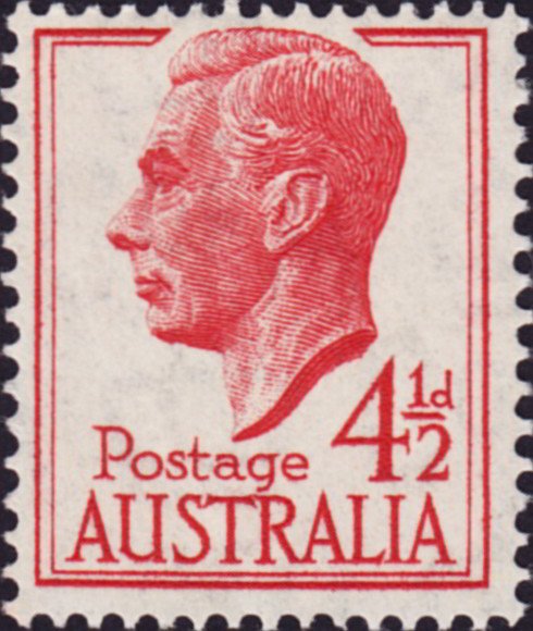 Visibility: public Image owner: none postage 2/20/1952 4 1/2d red issue=1951 dt=George VI profiles d=King George VI (1951 Australia) wmk=mult small crown & CofA perf=15x14 Crops No visible images cropped from this one. Measurements Resolution is unknown. Source Source name: Colnect File URL: http://i.colnect.net/b/3492/662/King-George-VI-1895-1952.jpg Uploaded October 10, 2017, 1:21 pm by Stan Shebs |