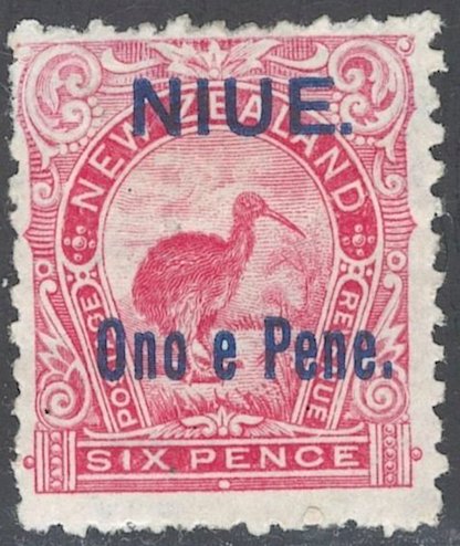 Visibility: public Image owner: none postage 7/2/1903 6p rose issue=1903 d=kiwi (1898) ovpt=NIUE.//One e Pene. oc=blk on=issuer=New Zealand-6p-rose-wmk=NZ & star (close) wmk=NZ & star (close) paper=thin white wove Crops No visible images cropped from this one. Measurements Resolution is unknown. Source Source name: Colnect File URL: http://i.colnect.net/b/4109/320/Overprint-on-Brown-Kiwi-Apteryx-australis.jpg Uploaded December 14, 2017, 2:47 pm by Stan Shebs |