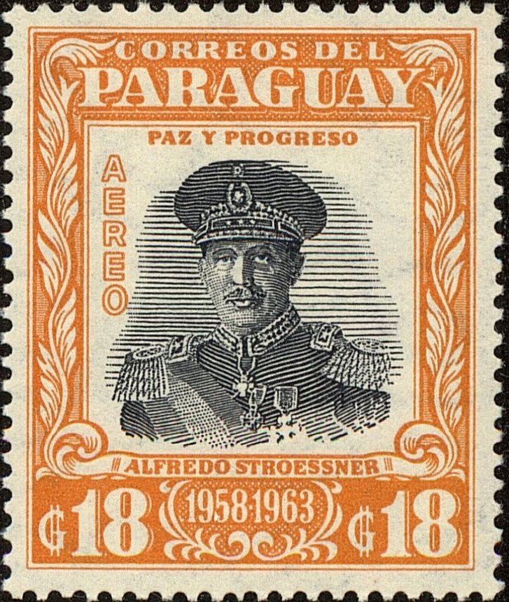 Visibility: public Image owner: none airmail 8/15/1958 18Gs issue=Stroessner reelection d=Alfredo Stroessner wmk=interlacing lines perf=13.5 Crops No visible images cropped from this one. Measurements Resolution is unknown. Source Source name: Colnect File URL: http://i.colnect.net/b/3826/775/Alfredo-Stroessner-1912-2006.jpg Uploaded December 27, 2017, 4:15 pm by Stan Shebs |