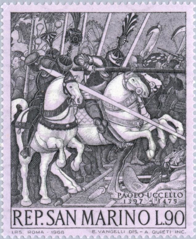Visibility: public Image owner: none postage 6/14/1968 90l multi dt=Battle of San Romano details wmk=triskelion perf=14 Crops No visible images cropped from this one. Measurements Resolution is unknown. Source Source name: Colnect File URL: http://i.colnect.net/images/b/171/753/Detail-from--ldquo-The-Battle-of-San-Romano-rdquo--by-Paolo-Uccello.jpg Uploaded August 26, 2014, 4:51 pm by Stan Shebs |