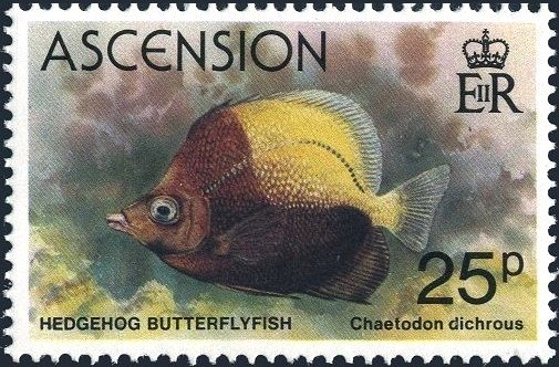 Visibility: public Image owner: none postage 9/15/1980 25p multi dt=fishes (1980 Ascension) d=Hedgehog Butterflyfish wmk=St Edwards crown & CA Crops No visible images cropped from this one. Measurements Resolution is unknown. Source Source name: Colnect File URL: http://i.colnect.net/b/4520/149/Hedgehog-Butterflyfish-Chaetodon-dichrous.jpg Uploaded April 12, 2018, 7:51 pm by Stan Shebs |