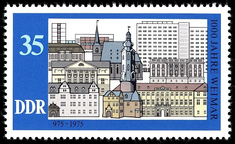 Visibility: public Image owner: none postage 9/23/1975 35pf multi issue=Weimar 1000th unwmk Crops No visible images cropped from this one. Measurements Resolution is unknown. Source Source name: Colnect File URL: http://i.colnect.net/images/b/351/603/Historic-and-new-buildings-in-Weimar.jpg Uploaded August 26, 2014, 6:00 pm by Stan Shebs |
