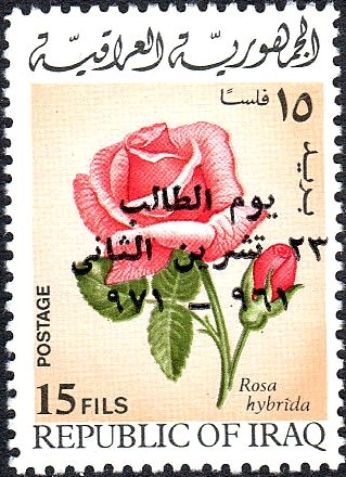 Visibility: public Image owner: none postage 11/23/1971 15f issue=Students' Day 1971 dt=flowers (1970 Iraq) d=Rosa hybrida (1970) oc=blk on=issue=Flowers 1970-15f unwmk perf=13 Crops No visible images cropped from this one. Measurements Resolution is unknown. Source Source name: Colnect File URL: http://i.colnect.net/b/5227/967/Rose.jpg Uploaded February 18, 2019, 3:03 pm by Stan Shebs |