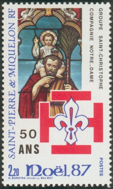 Visibility: public Image owner: none postage 12/9/1987 2.20fr multi issue=Christmas 1987 / 50th Anniversary of Scouting unwmk Crops No visible images cropped from this one. Measurements Resolution is unknown. Source Source name: Colnect File URL: http://i.colnect.net/images/b/876/263/Stained-Glass-St-Christopher--Cross-Scout.jpg Uploaded August 26, 2014, 10:37 pm by Stan Shebs |