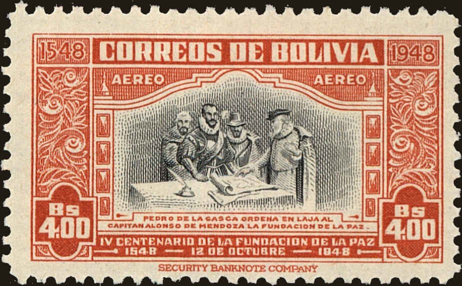 Visibility: public Image owner: none airmail 3/15/1951 4b redorg&blk issue=La Paz 400th d=La Gasca ordering Mendoza to found La Paz unwmk Crops No visible images cropped from this one. Measurements Resolution is unknown. Source Source name: Colnect File URL: http://i.colnect.net/b/5396/146/La-Gasca-ordering-Mendoza-to-found-La-Paz.jpg Uploaded November 9, 2019, 3:20 pm by Stan Shebs |