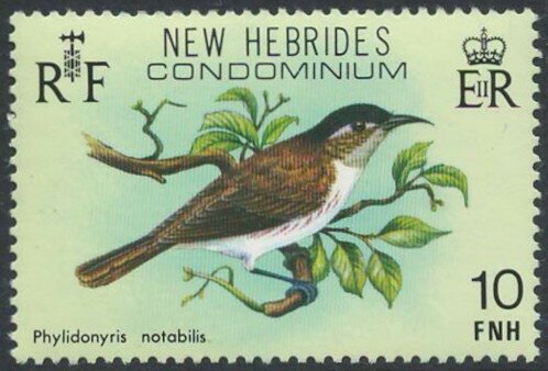 Visibility: public Image owner: none postage 2/27/1980 10fr multi dt=birds (1980 New Hebrides (Br)) d=Phylidonyris notabilis (1980) wmk=mult crown & script CA Crops No visible images cropped from this one. Measurements Resolution is unknown. Source Source name: Colnect File URL: http://i.colnect.net/b/5706/664/White-bellied-Honeyeater-Phylidonyris-notabilis.jpg Uploaded November 22, 2019, 9:29 pm by Stan Shebs |