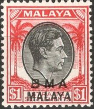 Visibility: public Image owner: none postage $1 red&blk pc=bl issue=1945 BMA d=King George VI & palms ovpt=BMA//MALAYA oc=blk on=issue=1937-$1-red&blk-pc=bl wmk=mult crown & script CA perf=14 Crops No visible images cropped from this one. Measurements Resolution is unknown. Source Source name: Colnect File URL: http://i.colnect.net/b/6010/247/Overprinted--BMA-Malaya-.jpg Uploaded February 20, 2020, 8:16 pm by Stan Shebs |