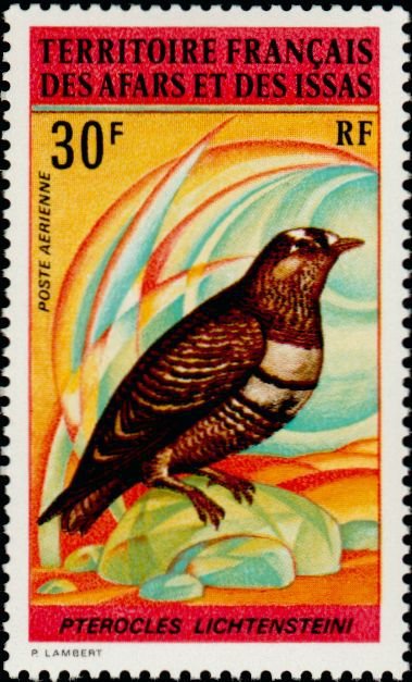 Visibility: public Image owner: none airmail 4/21/1972 30fr multi issue=birds dt=birds (1972 Afars) d=Pterocles lichtensteini unwmk perf=13 Crops No visible images cropped from this one. Measurements Resolution is unknown. Source Source name: Colnect File URL: http://i.colnect.net/b/793/009/Lichtenstein-s-Sandgrouse-Pterocles-lichtensteini.jpg Uploaded April 25, 2020, 5:25 pm by sanguesa |