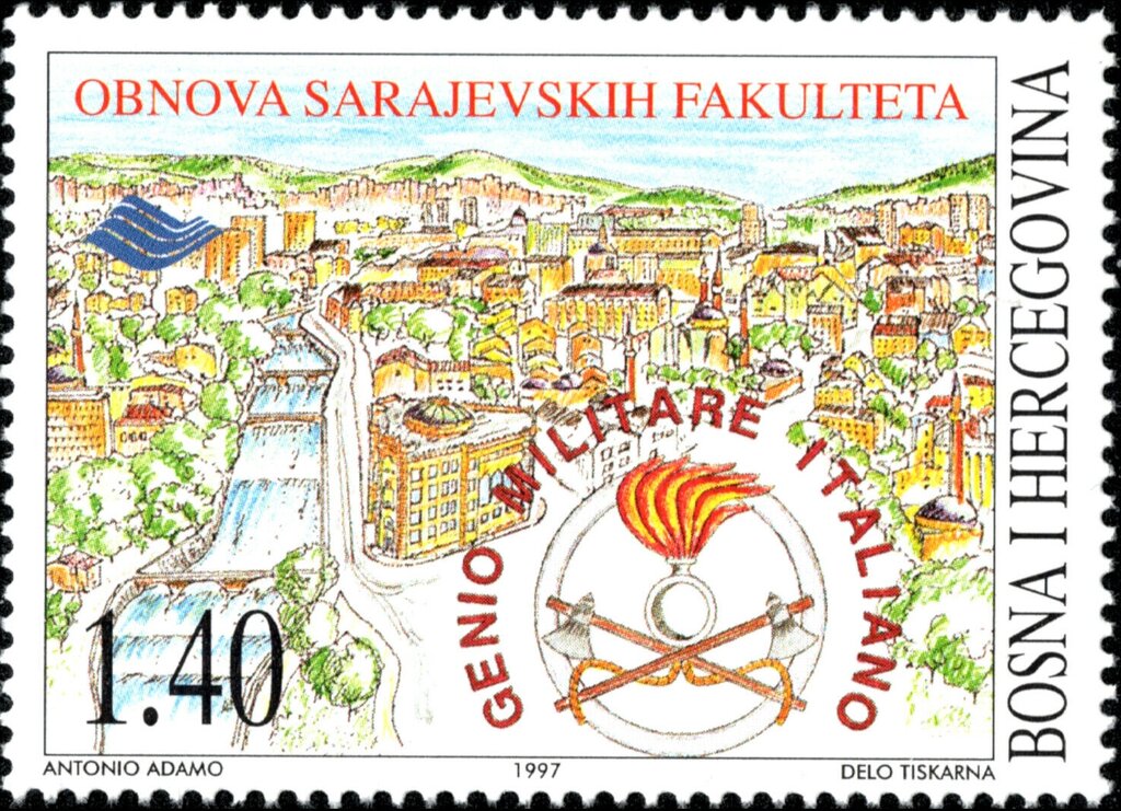Visibility: public Image owner: none postage 11/1/1997 1.40mk multi issue=Italian Pioneer Corps Helping Rebuilding Sarajevo unwmk perf=13.75 Crops No visible images cropped from this one. Measurements Resolution is unknown. Source Source name: Colnect File URL: http://i.colnect.net/b/5967/372/Rebuilding-Universities-of-Sarajevo.jpg Uploaded May 9, 2020, 1:56 am by Stan Shebs |
