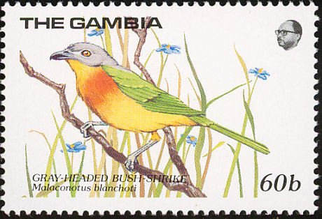 Visibility: public Image owner: none postage 4/24/1989 60b multi issue=Birds of West Africa dt=West African birds d=Malaconotus blanchoti unwmk perf=14 Crops No visible images cropped from this one. Measurements Resolution is unknown. Source Source name: Colnect File URL: http://i.colnect.net/b/1462/489/Grey-headed-Bushshrike-Malaconotus-blanchoti-.jpg Uploaded August 30, 2014, 6:00 pm by Stan Shebs |