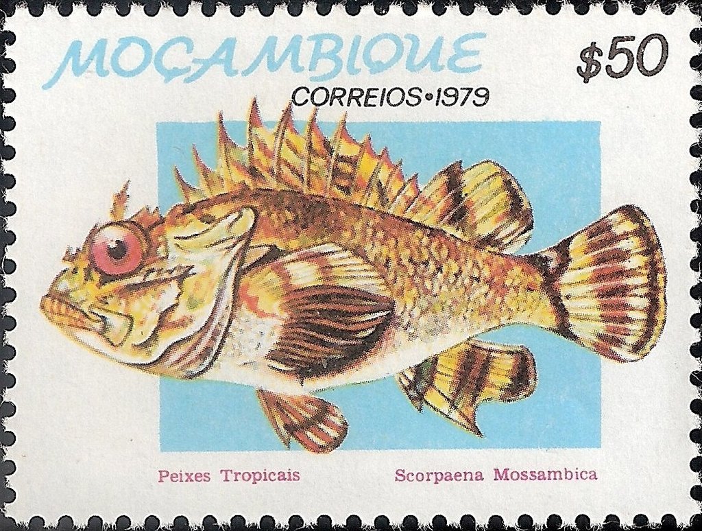 Visibility: public Image owner: none postage 9/7/1979 0.50e multi dt=tropical fishes (1979) d=Mozambique Scorpionfish Scorpaena mossambica unwmk perf=11 Crops No visible images cropped from this one. Measurements Resolution is unknown. Source Source name: Colnect File URL: http://i.colnect.net/images/b/1116/030/Mozambique-Scorpionfish-Scorpaena-mossambica.jpg Uploaded September 1, 2014, 1:31 pm by Stan Shebs |