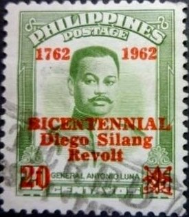 Visibility: public Image owner: none postage 11/15/1962 20s yelgrn d=Antonio Luna ovpt=1762 1962//BICENTENNIAL//Diego Silang//Revolt//20 oc=blk on=1958-25c-yelgrn unwmk perf=11 Crops No visible images cropped from this one. Measurements Resolution is unknown. Source Source name: Colnect File URL: http://i.colnect.net/b/1570/415/Diego-Silang-Revolt.jpg Uploaded September 1, 2014, 4:49 pm by Stan Shebs |